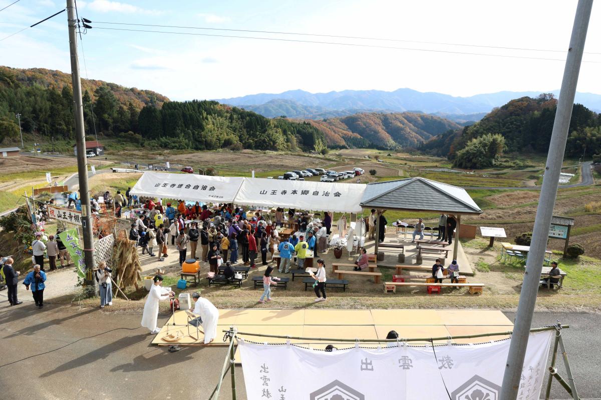 山王寺の棚田展望台(雲南市大東町山王寺)で11月23日、棚田でとれた米の収穫を祝う山王寺棚田祭りが行われた。