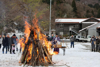 雲南の入間交流センター(雲南市掛合町入間)で1月10日、時折強い風が吹く中、毎年恒例の「とんどさん」が行われた。