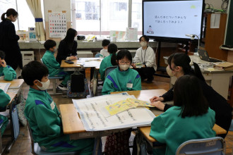 雲南市の「スペシャルチャレンジ・ジュニア プログラム」で活動する三刀屋高校生6人が1月21日、木次子ども園(雲南市木次町新市)と加茂小学校(加茂町加茂中)で出張授業を行った。