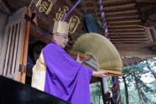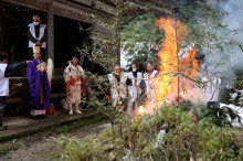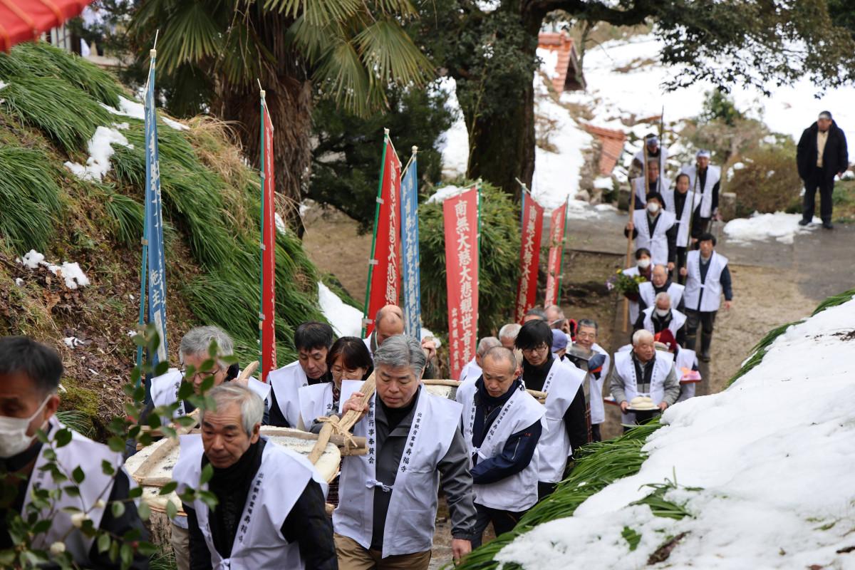 雲南・飯石の寿福寺(雲南市三刀屋町多久和)で2月1日、奈良東大寺二月堂「修二会(しゅにえ)」の流れをくみ平安時代から伝わる「堂餅行事」が行われ、檀家や地域の代表たちが白い法被に身を包んで参加した。