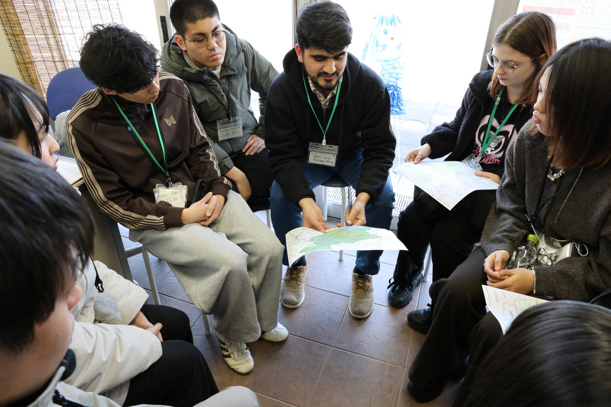 島根大学の学生や留学生が3月5日、雲南市内各所を巡って地域探求を行い、佐世交流センター(雲南市大東町佐世)で餅つきを体験した。