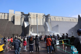 尾原ダム(雲南市木次町平田)で3月7日、「尾原ダムクレストゲート点検放流イベント in さくらおろち湖」が開かれ、時折雪がちらつく寒さの中にもかかわらず多くの家族連れやダムファンが訪れ、年に一度の迫力ある放流を楽しんだ。