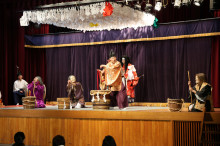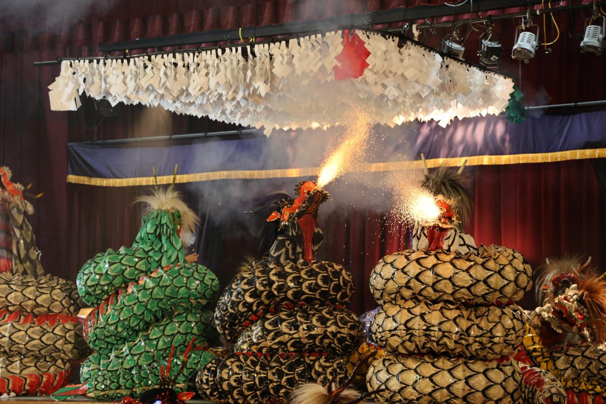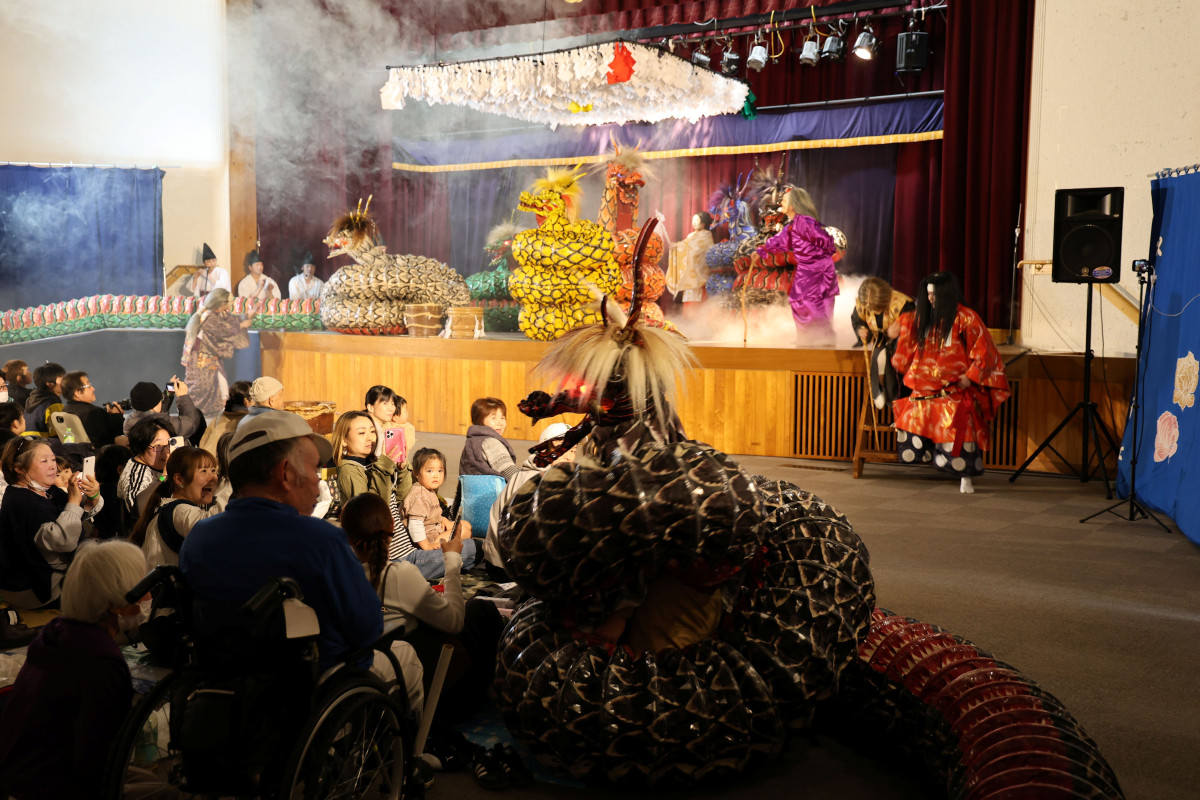 飯南・赤名の赤名農村環境改善センター(飯南町下赤名)で3月29日、飯南神楽団、穴笠神楽団(広島県三次市)、出羽神楽団(島根県邑南町)による神楽交流大会が開かれた。