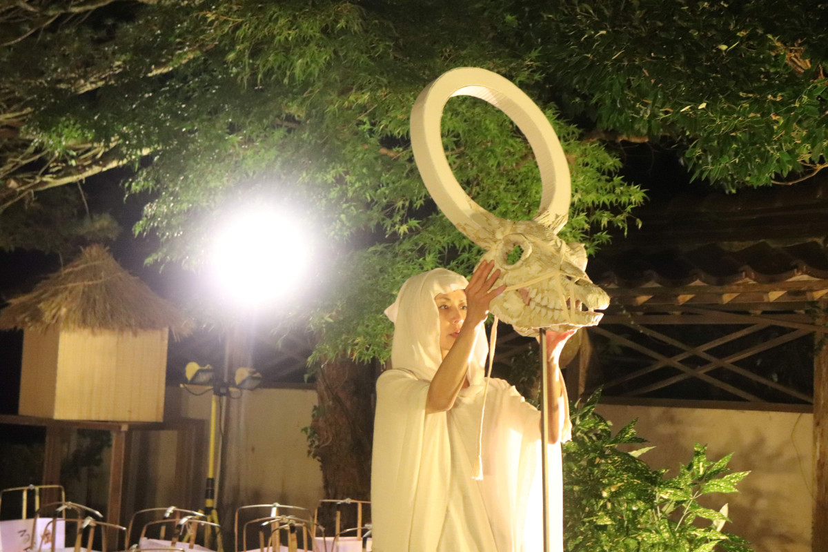 関係者のあいさつや屋敷内の作品の説明が終わると、前庭で井上嘉和さんの段ボール牛お面を付けた舞踏家東野祥子さんが三刀屋太鼓に合わせてインプロビゼーション演舞を披露し、集まった人たちから拍手が送られた。