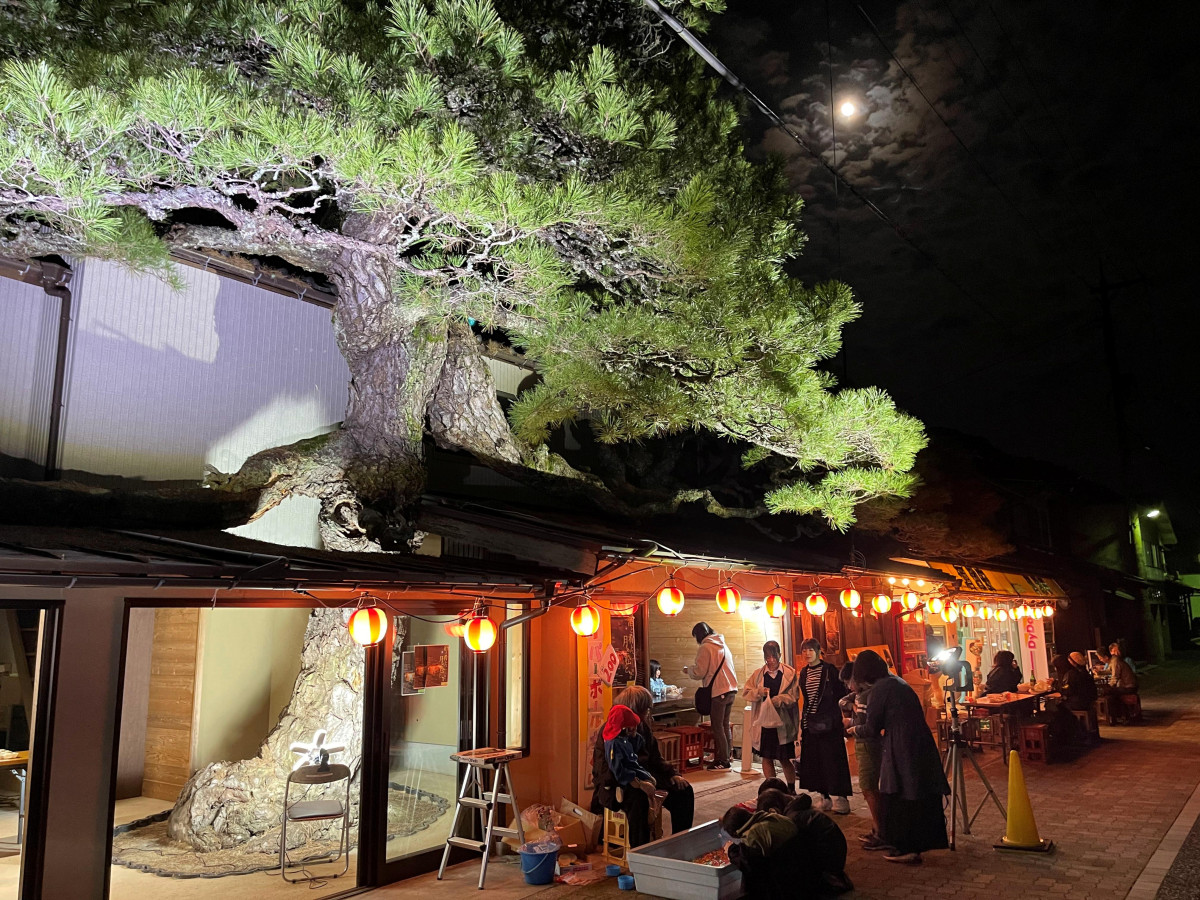 八日市の名物「浪花家の大松」で知られる浪花酒店(雲南市木次町八日市)で11月4日、角打ちイベント「第2回 酒と肴(さかな)と月と松と」が開かれた。主催は浪花酒店と遠足計画。