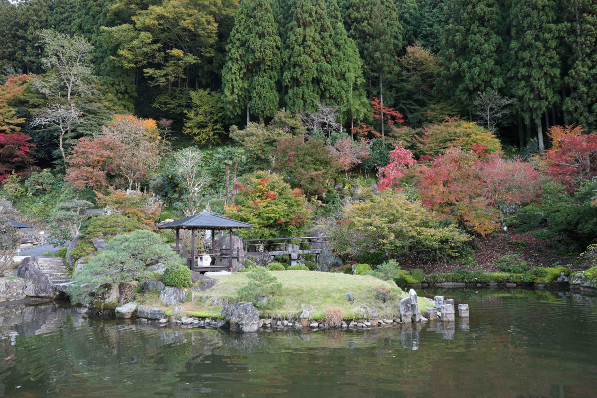 山を背景にした大滝と巨石の石組みによる回遊式日本庭園が特徴の同園では、春のシャクナゲ、初夏の花ショウブ、盛夏の流しそうめんなど、季節に合わせた催しを開いている。朝の冷え込みが厳しくなってきた11月になり木々の色づきが深まってきた。紅葉は11月15日~24日が見頃だという。