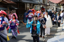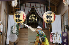 波多神社(雲南市掛合町波多)で11月14日、秋の祭礼が行われた。昼には波多地区の人たちと三刀屋高校掛合分校の生徒が「はやしこ」で波多の街なかから波多神社まで練り歩き、夜には波多神社で伝統の奥飯石神楽を奉納した。