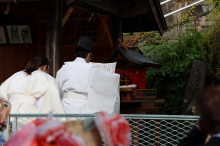 「はやしこ」は街なかの小さな社でいったん休憩。担いできたみこしを社の前の置き、神職が祝詞を上げ神事を行った。その後「はやしこ」は街はずれにある波多神社まで歩いた。