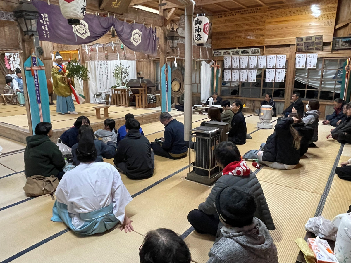17時30分ころには波多神社の拝殿内で、波多神楽保存会による奥飯石神楽の奉納が始まった。同神楽は約400年の歴史があるという。神職による「七座神事」が省略されることなく舞われ、その間に地域の人たちが三々五々拝殿内に集まってきた。その後、「式三番」「新能」と続き、「神能」で舞われる八岐大蛇(ヤマタノオロチ)の姿は独特で、蛇幕の中に3人が入って演じた。