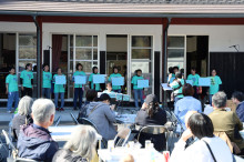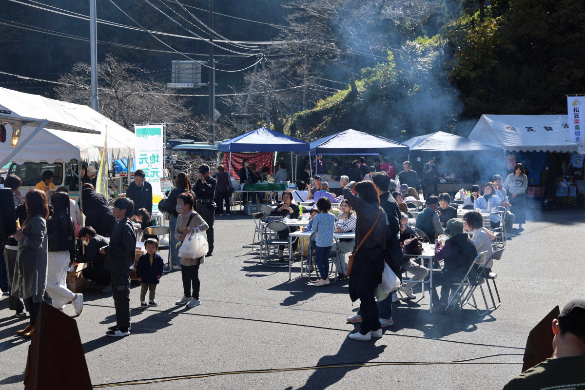 掛合町松笠地区では松笠ご縁の館(掛合町松笠)で「松笠ご縁の館市」を開催。松笠そば、大判焼き、焼きそば、焼き鳥、焼きイカ、飲料などの飲食ブースや、健康測定などの体験ブースが同館前の駐車場に並び、地域の人たちが楽しんだ。午後からは同館の軒下で「霜月軒下余芸大会」を開き、さつきコーラスの合唱や松笠ドリフターズのひげダンスを披露。石飛厚志雲南市長も練習中のウクレレで2曲を披露し、盛んに拍手を浴びた。
