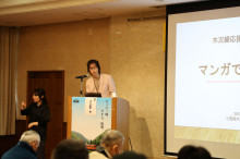 江上さんはコミックによる聖地巡礼ブームとなった地域の事例を紹介。「沿線に有り余るほどの魅力がある木次線での聖地巡礼のブームが起こせるように、たくさんの人に同コミックを読んでもらい地元で盛り上げてほしい」と話す。江上さんは完成したばかりの同コミック500冊を木次線利活用促進協議会に寄贈した。
