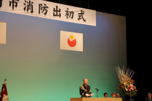来賓の祝辞の後、妹尾芳行雲南市消防団長が訓示を行い、昨年の大船渡市、岡山市、今治市の大規模林野火災や大分市の大規模建物火災に触れ、特に林野火災の大規模化に対して予防啓発の重要性を強調した。昨年の活動として市内での4件の建物火災、11件の林野・原野火災への出動、普段の消火訓練や高齢者施設などでの避難訓練、予防啓発活動などに触れ、「今年も地域の安心・安全を守るために誇りを持って取り組んでほしい」と呼びかけた。