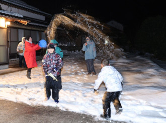 飯南町頓原の張戸集落で1月10日、新年を祝う奇祭「とろへい」が行われ、子どもたちが集落の家々を訪れ、清めの水を浴びせて子どもたちの無病息災を祈った。