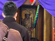 観音堂の横では、護摩祈とうの火が放たれ住職の読経が続いた。読経が終わると訪れた人たちに酒と飯が振る舞われた。本来は33年に1度しか開かれない聖観世音菩薩(ぼさつ)像が開帳され、訪れた地域の人たちが代わる代わる観音堂の中に入り菩薩像を拝んだ。