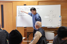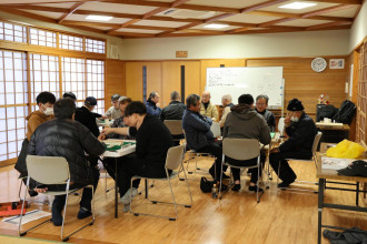 当日は大雪の中でも、多根から3人、入間から2人、松笠から11人の計16人が参加。30~80代の世代を超えた参加者が集まった。くじ引きで席を決め、4卓を囲んで座った。企画したCNCの井上啓介さんがルールを説明した後、早速、健康マージャンが始まり、パイを交ぜる音が室内に響いた。普段の集まりでは世間話などワイワイやりながらゲームが進むが、この日は点数を競って上位3位に景品を用意しているとあり、参加者は静かにゲームに集中した。