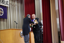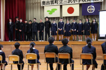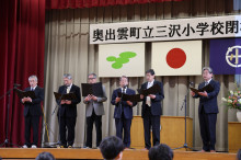 難波真章校長が「三沢の子どもたちの学びは今後も続いていく。わが校と支えて来たもらった地域の人たちに感謝したい」とあいさつ。みんなで校歌を斉唱した後、校旗が難波真章校長から糸原保奥出雲町長へ返納され、式典を終えた。