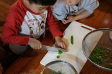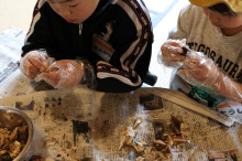子どもたちは手分けをして、絹サヤを刻んだり、薄く焼いた卵を刻んで錦糸卵を作ったり、丸ごとの焼きサバから骨を外して身をほぐしたりして、お昼に食べる焼きサバずしを用意した。
