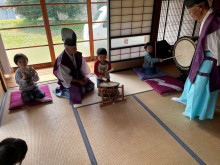 午後は、西日登神楽社中による神楽を見学した後、神楽の衣装を着てみたり、鐘や太鼓をたたいてみたり、本物に触れる機会となった。神楽の演目としても知られる出雲神話「ヤマタノオロチ」の紙芝居を楽しんだ後、西日登神楽社中の吉川創太さんから神楽の話を聞いた。吉川さんは、天災の多い日本では昔の人は神に祈ることしかできなかったこと、音楽や踊りが神様を喜ばせ願いを聞いてもらえると考えて神楽をするようになったこと、日本中には1万を超える神楽があり、47都道府県の全てに神楽があることなどを話し、「神楽は何のためにするのか、自分の住んでいる近くにある神楽にも興味を持ってほしい」と呼びかけた。