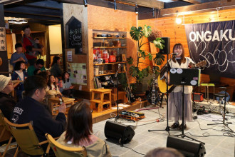 当日は、地元出身の落合孝行さんがボーカルを務めるバンド「落ちブラ」や、今年で結成25周年を迎えるバンド「ソルティードッグ」が演奏と歌を披露した後、初出演となる松江在住のもちさんが登場。保育士をしながら山陰を中心に活動しているもちさんは、親子連れの来店者が多かったことから、「どらえもん」や「ジブリ」の歌でステージを展開。ファーストシングルの「たまごやき」などを披露した。