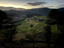 古民家に戻った参加者に山本さんが「追谷たたら絵巻」を上映し地域の歴史を伝えた。日没が近づくと追谷棚田展望所へ行き、たたら製鉄の材料となる砂鉄を採取するために切り崩されてできた棚田に明かりがともされた幻想的な風景を楽しんだ。古民家に戻ると古谷さんが和ハーブを使った調理を披露。参加者全員で夕食を楽しんだ。