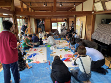 途中で広間がいっぱいになり、急きょ、板の間にもブルーシートを敷き、追加のべニア板2枚を置いた。車を描く子どもや、怪獣を描く子ども、足裏や手のひらに絵の具を塗って足型や手形を押していく子ども、手のひらいっぱいに絵の具を盛りべニアの上で絵の具を混ぜるように描く子ども、秋の夕暮れを描く大人など、みんなが「お絵描き」を楽しんだ。