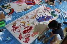 当日は25組以上の親子が次々と集まってきた。1階の広間にブルーシートを敷き、その上に白いべニア板3枚を置き、絵の具や筆なども用意して「好きに描いていいよ」と声をかけると、子どもたちが思い思いに絵を描き始めた。