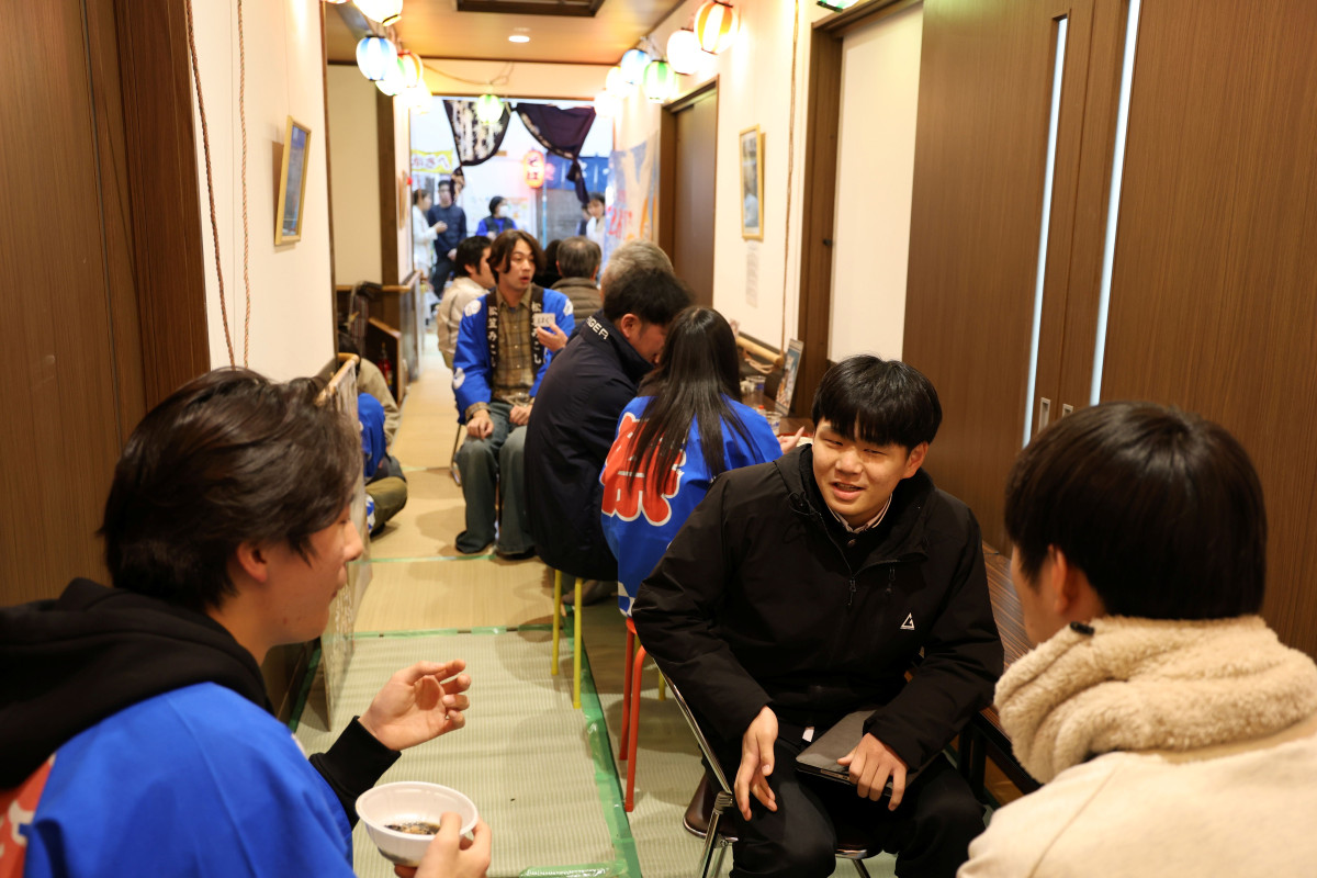 雲南の松笠交流センター(雲南市掛合町松笠)で2月17日、同地域でフィールドワークを行う大学生と一緒に「みんなで居酒屋」が開かれた。