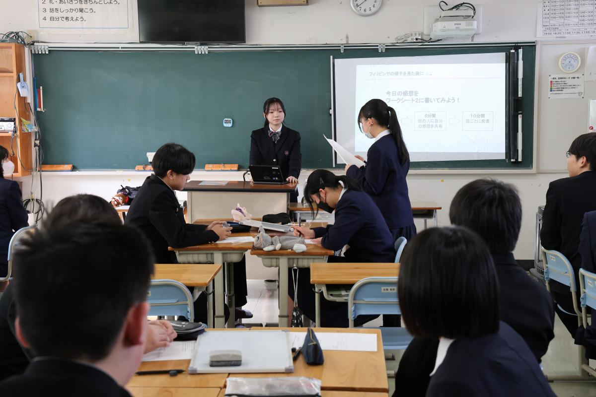 雲南市スペシャルチャレンジジュニアプロジェクトで海外留学を経験した高校生2人が2月4日・5日、それぞれ加茂児童クラブと木次中学校で出張授業を行い、留学先に体験したことや、そこから感じたことなどを児童や生徒たちに伝えた。