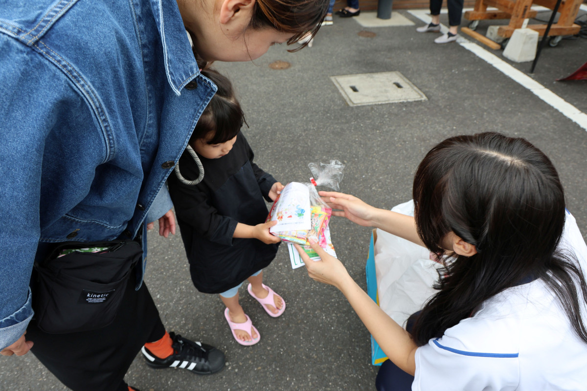 会場を訪れた子どもに三刀屋高校JRCのボランティアが菓子をプレゼント