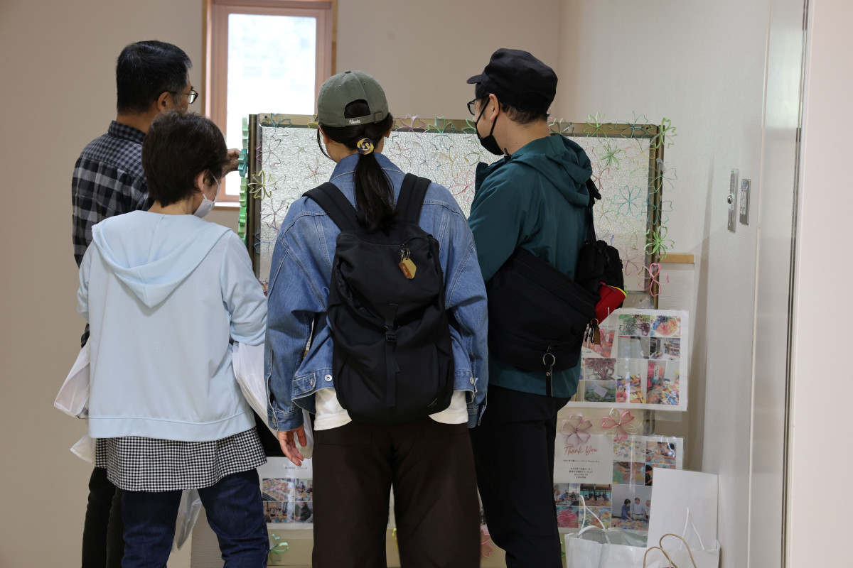 訪れた人に芯アートの展示を説明するCNCメンバー