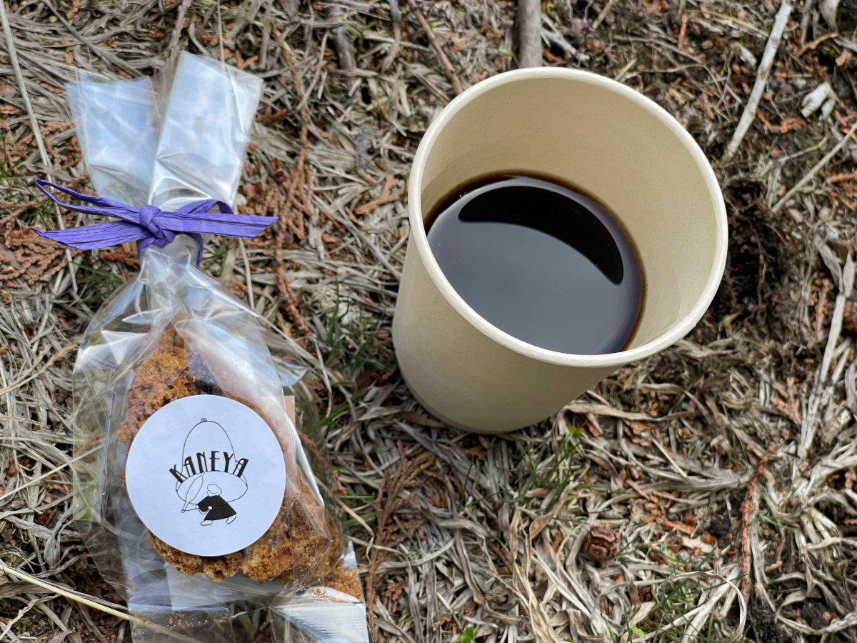 山本さんがドリップしたコーヒーと鐘やの松島さんがこのために焼いたオレンジピールのビスコッティを楽しんだ