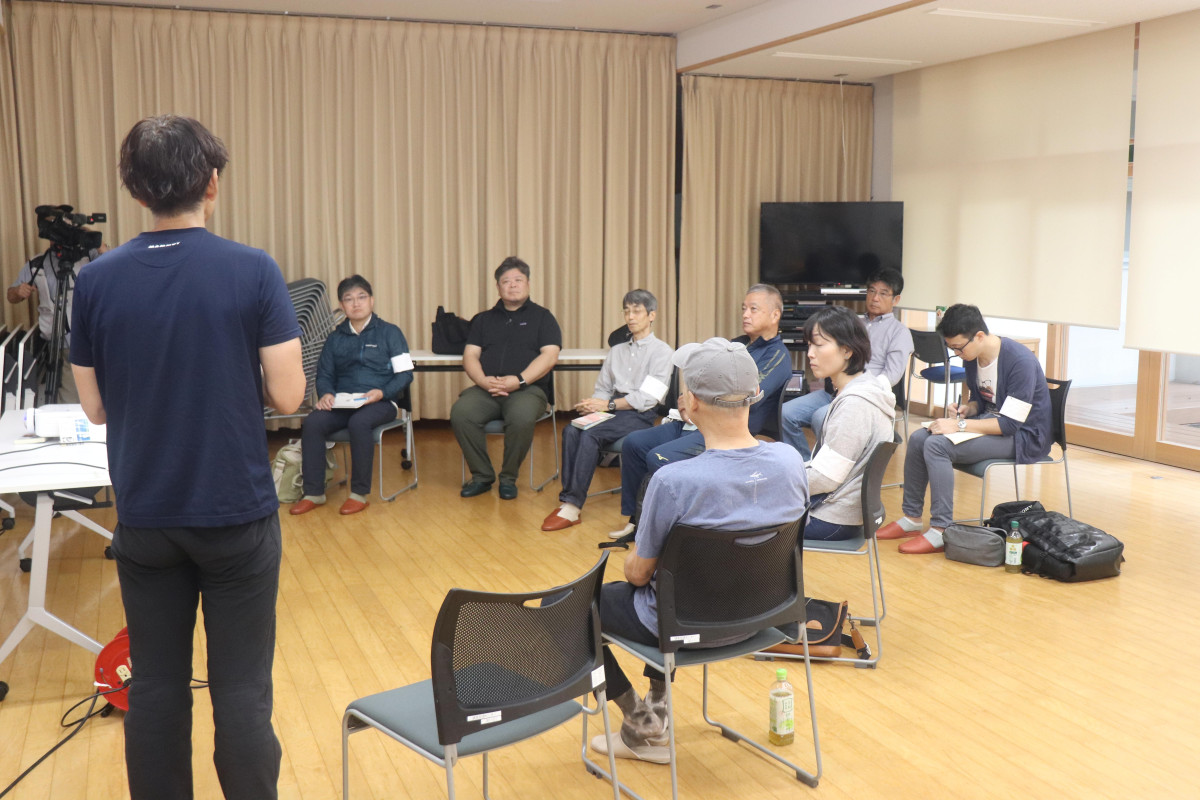 波多交流センターに集まり、講師の柄木さんの講話を聞く参加者たち