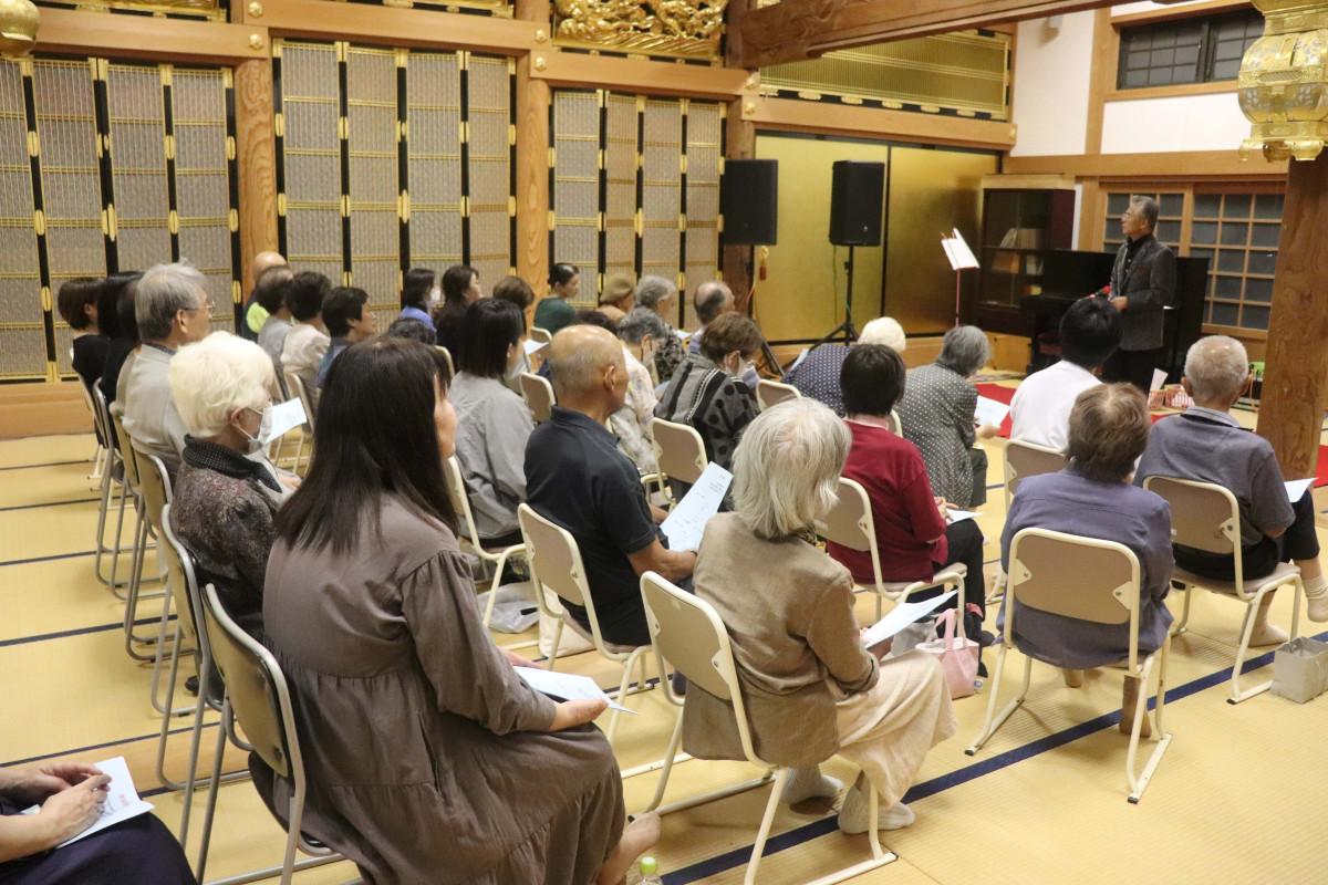 本堂に集まって須山さんの歌声を聞く参加者たち