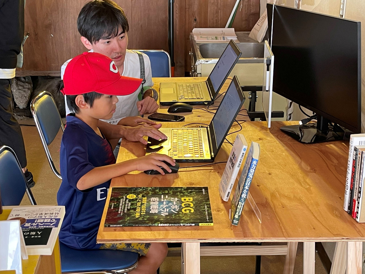 秋の古本市でエネルギー関連の古本販売と共に、電気を街に届けるゲームを楽しんでもらう雲南でエネルギー自治を実現する会のスタッフとゲームを楽しみ参加者