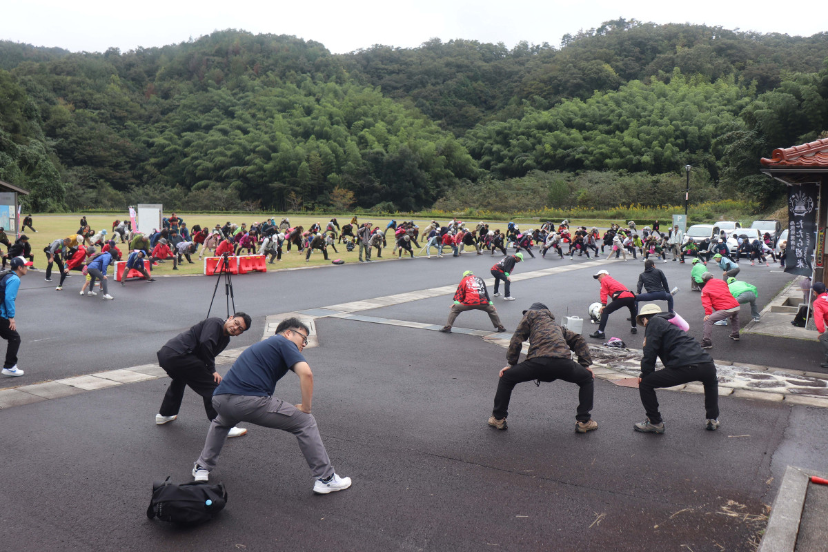 さくらおろち湖を巡るウオーキング大会に240人が集まり、出発前の準備体操を行った