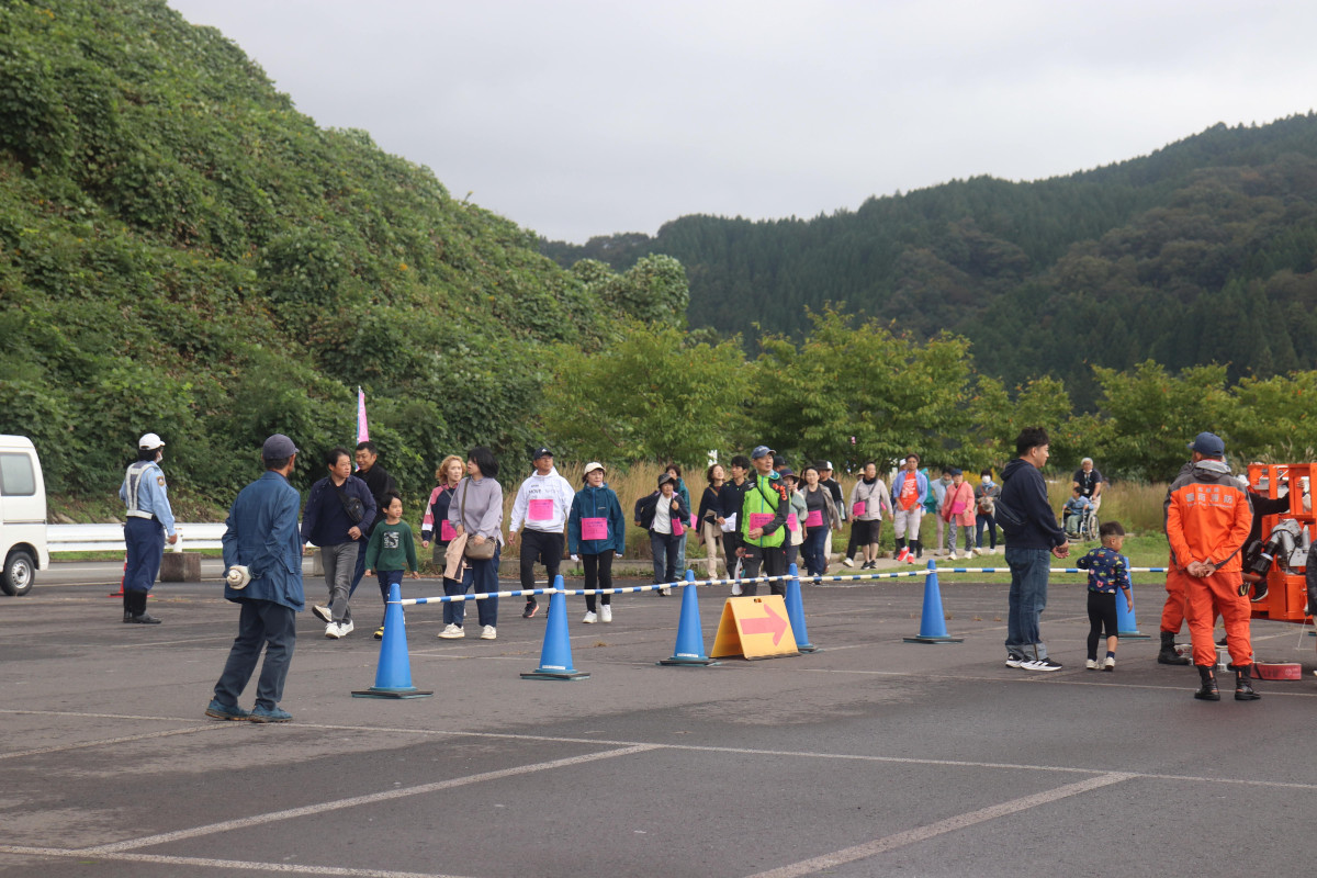 1時間余りで中間地点の「さくらおろち湖祭り」の会場に到着したウオーキング大会の参加者たち