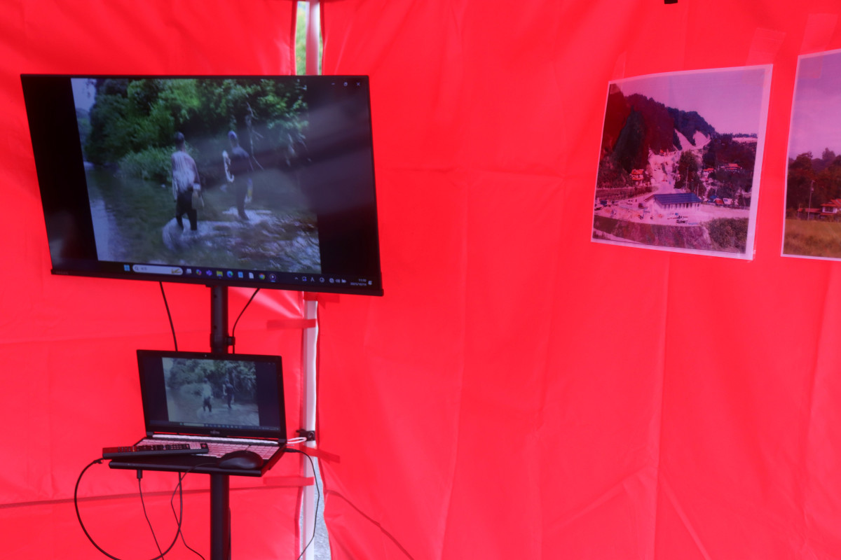 会場には尾原ダム建設により沈んだ北原・尾原地区の様子を動画や写真で紹介するブースも設置した