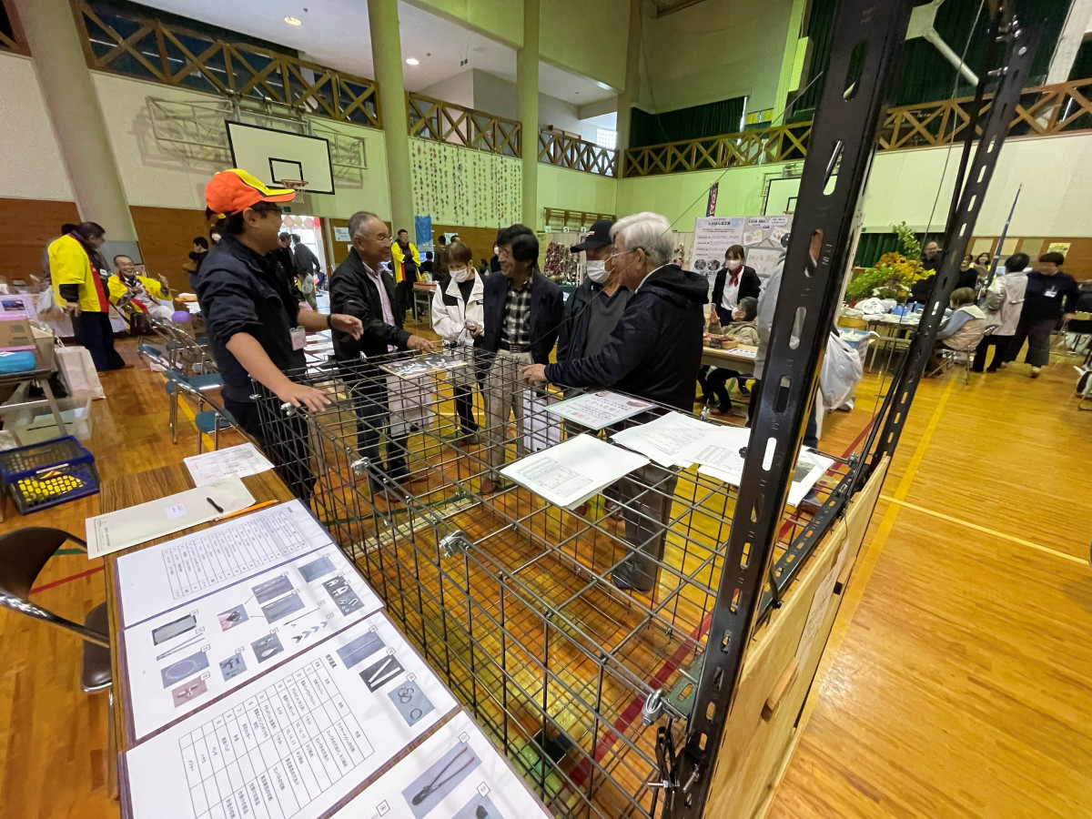 林業振興課は箱わなを展示して、地域の人たちに獣害対策を呼びかけた