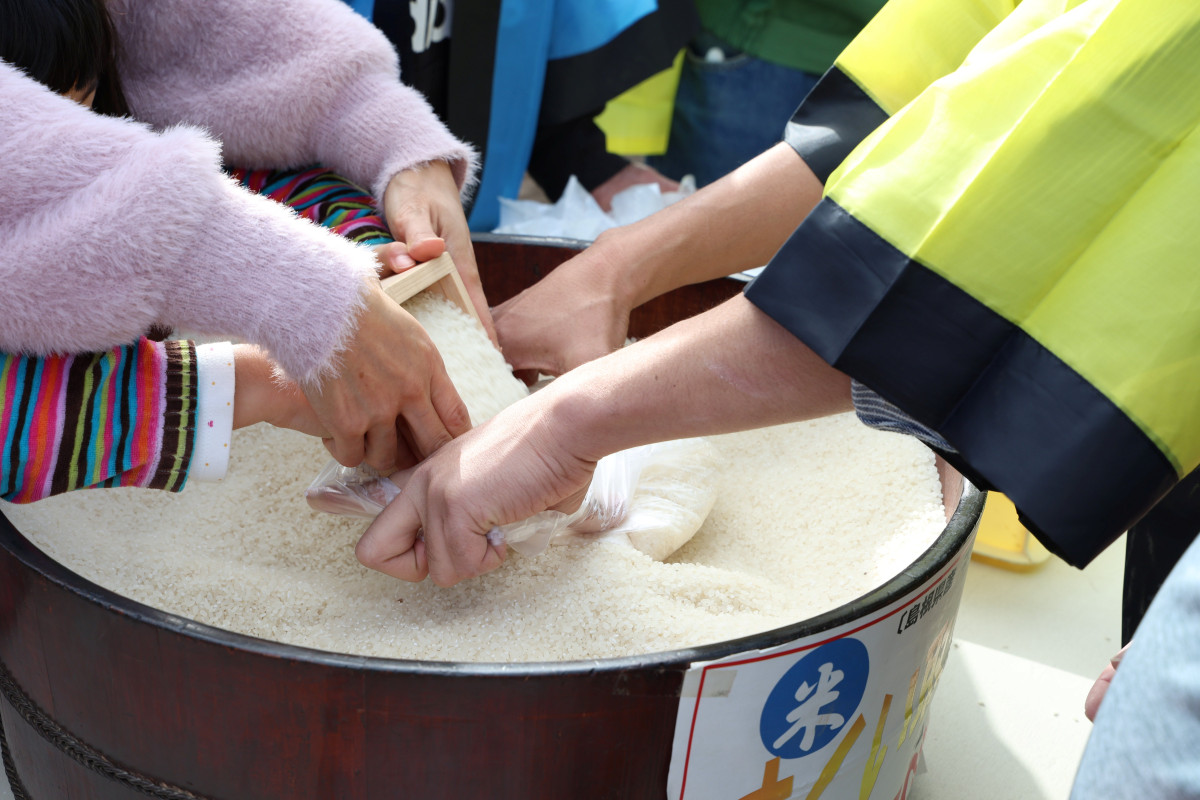 棚田で収穫した棚田舞のすくいとりを行い、参加者は2合升にいっぱい米をすくった