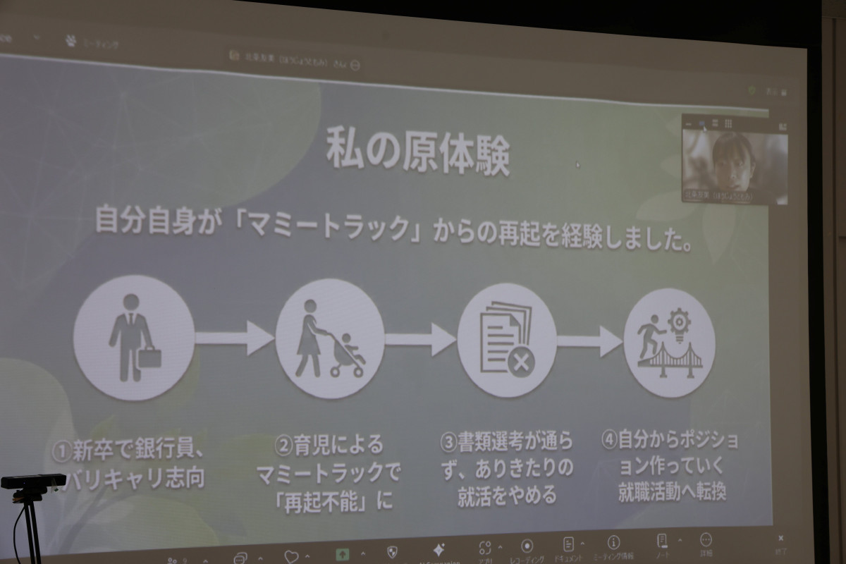 最優秀賞の北条さんは自分の体験「マミートラック」からの再起を説明