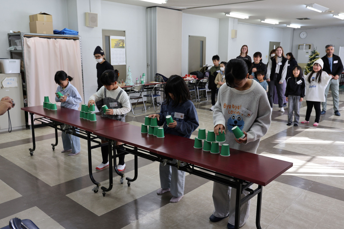 紙コップでツリーをつくるリレーを楽しむ子どもたち
