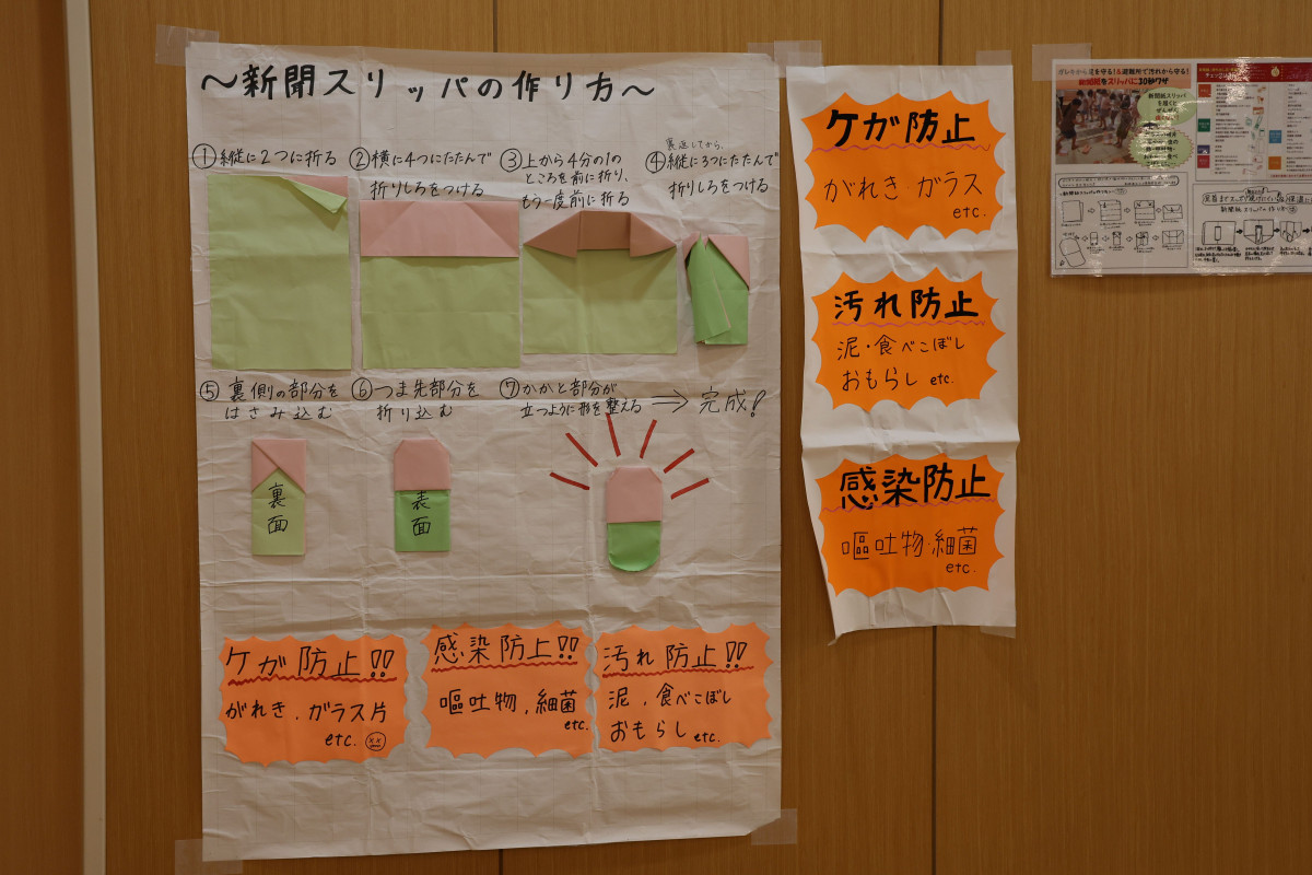 三刀屋高校JRC部が紹介した新聞紙スリッパの作り方を掲出し、実際に新聞紙スリッパの体験も提供した