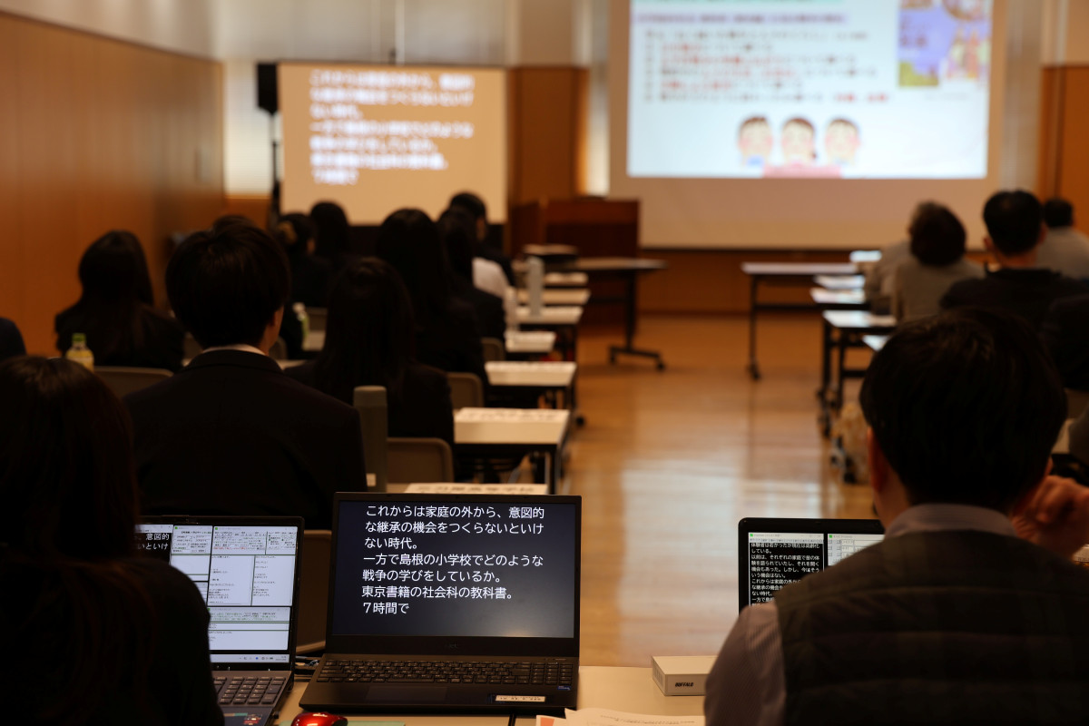 会場には手話の同時通訳の他、同時に文字起こしも行い、講演内容を即時に前のスクリーンで見れるようにした