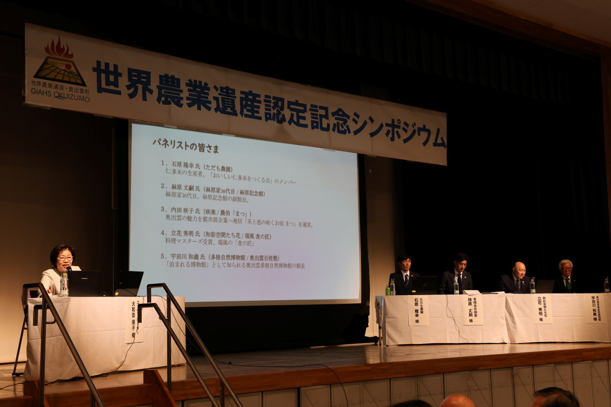 奥出雲町カルチャープラザ仁多(奥出雲町三成)で12月19日、「世界農業遺産の認定と今後の活用策を考える~「たたら製鉄を期限とした奥出雲町の農業」の可能性~」と題した、世界農業遺産認定記念シンポジウムが開かれた。