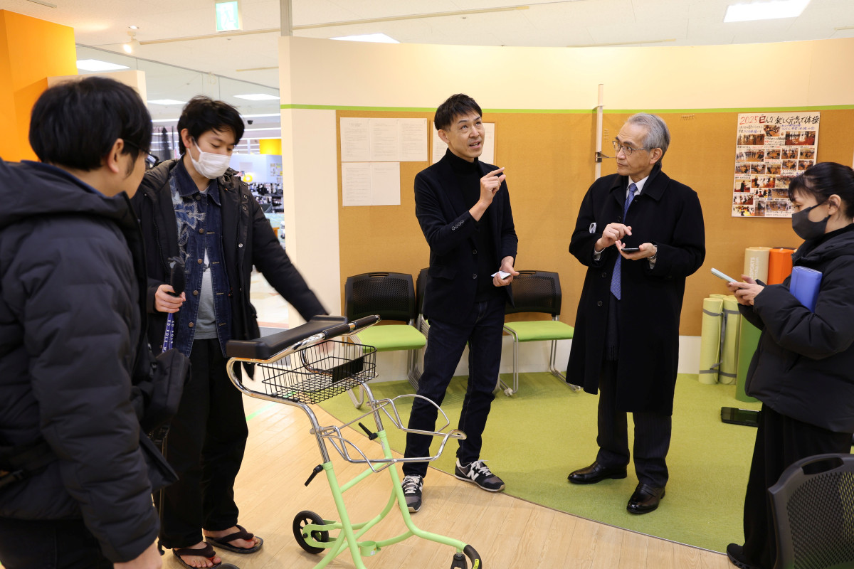 マルシェリーズ2階でショッピングリハビリ事業について伊原次官に説明する光プロジェクトの杉村卓哉代表