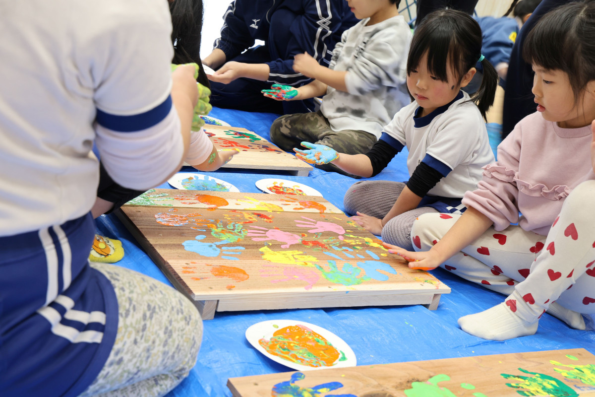 肌に優しい絵具を手につけて手形をコンポストの部材につける園児たち