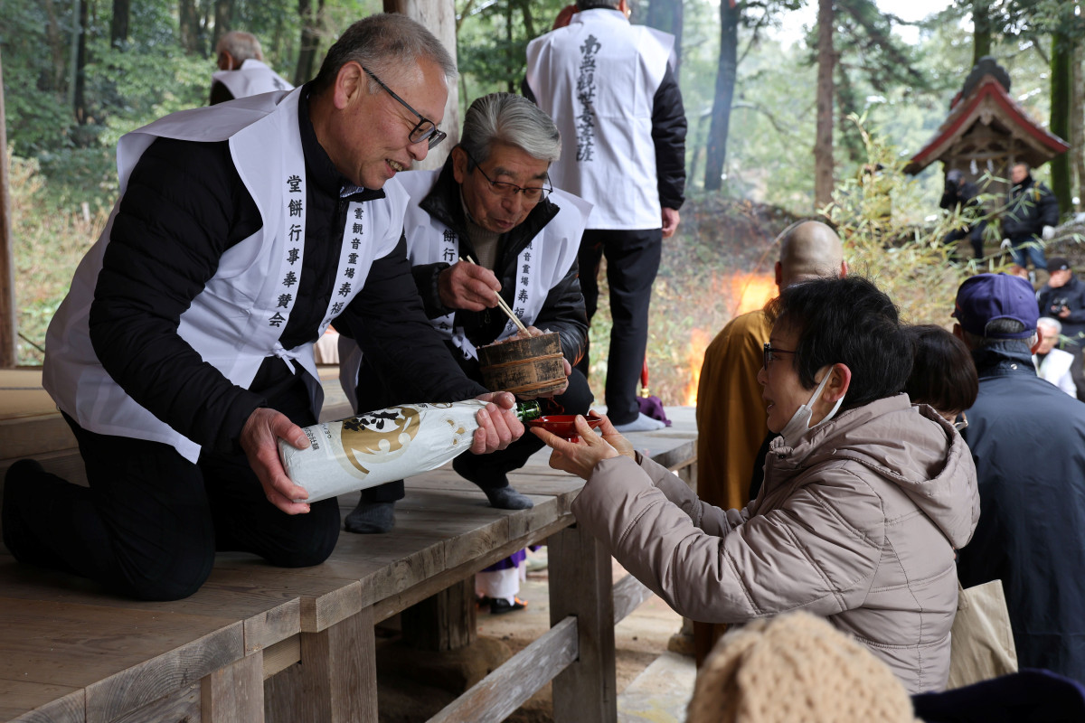 雲南・飯石の寿福寺(雲南市三刀屋町多久和)で2月1日、奈良東大寺二月堂「修二会(しゅにえ)」の流れをくみ平安時代から伝わる「堂餅行事」が行われ、檀家や地域の代表たちが白い法被に身を包んで参加した。