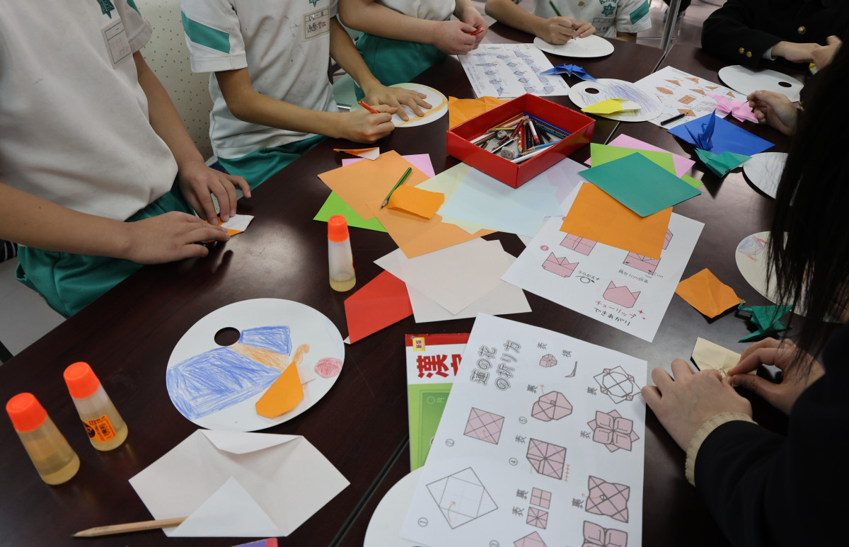 韓国の民族衣装「チマチョゴリ」にいろいろな色が使われていることから、好きな色を塗ってうちわ作りをした