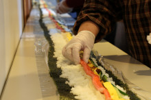 雲南の入間交流センター(雲南市掛合町入間)で2月14日、長のり巻き作りが行われ、地域内外から参加した20~90代の男女21人がのり巻き作りを楽しんだ。