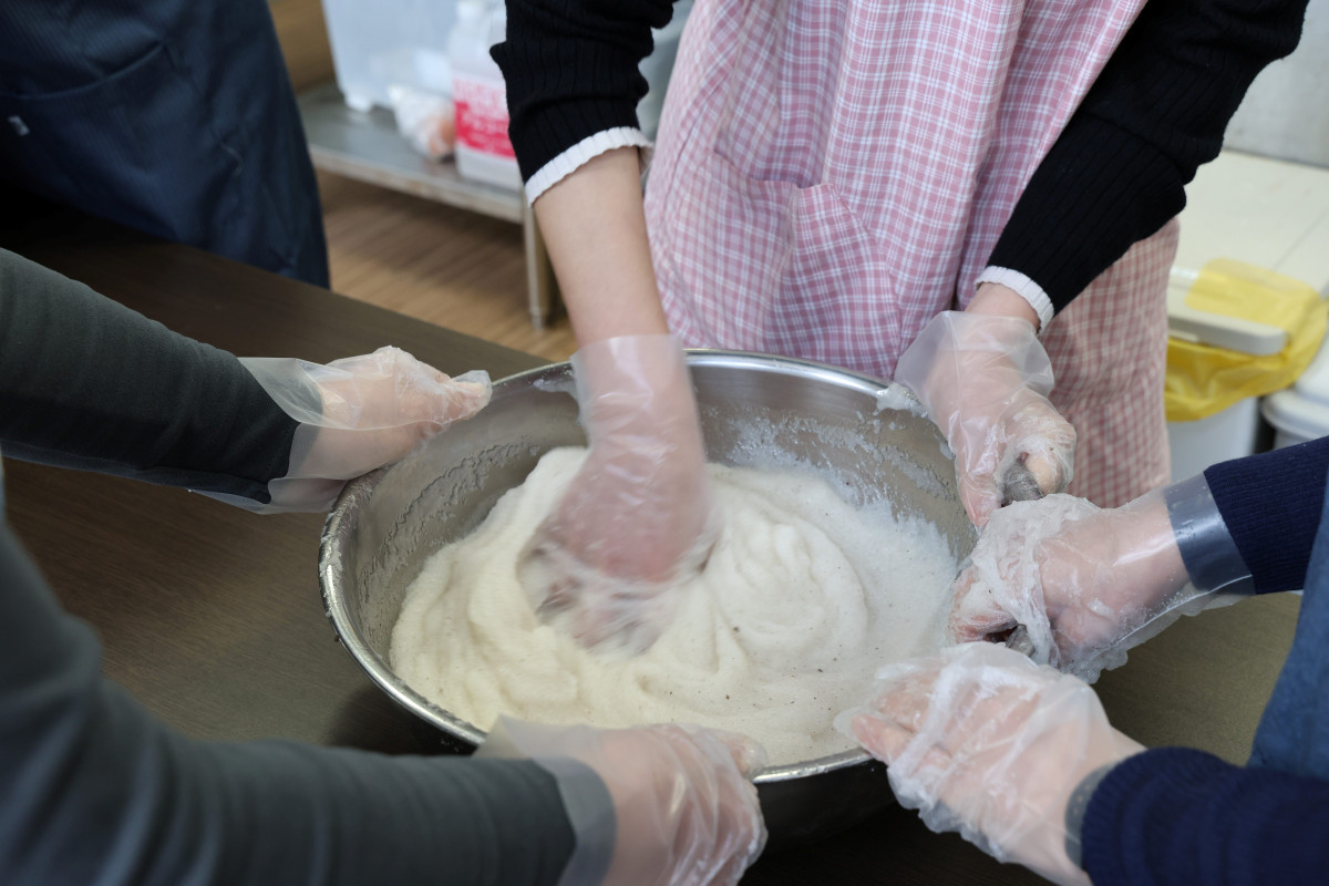 水を加えてミキサーにかけた後、炭酸ナトリウムを入れてかき混ぜると徐々に粘りが出てきた